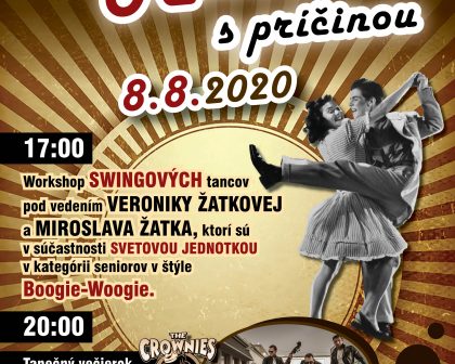 17:00 h Workshop swingových tancov pod vedením VERONIKY ŽATKOVEJ a MIROSLAVA ŽATKA, ktorí sú v súčasnosti svetovou jednotkou v kategórii seniorov v štýle Boogie-Woogie. 20:00 h Tanečný večierok s koncertom kapely THE CROWNIES. Rezervácie na: Mobil: +421 951 232...