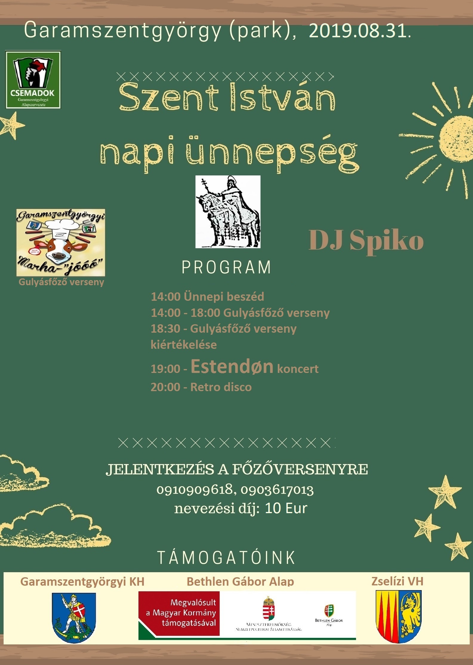 A Csemadok garamszentgyörgyi alapszervezete szeretettel meghív minden kedves érdeklődőt Szent István napi ünnepségére, amely augusztus 31.-én kerül megrendezésre a garamszentgyörgyi parkban.